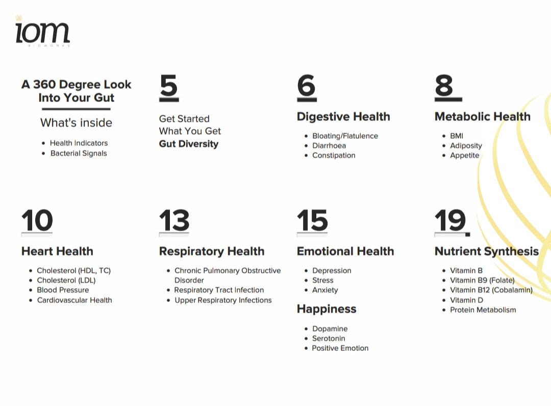 Gut 360 goes beyond basic testing to deliver a complete picture of your microbiome. We analyze 24 health metrics and 18 microbial outputs to understand exactly how your gut bacteria are affecting your health. You’ll receive matched prebiotic recommendations, a personalized dietary plan, and a follow-up consultation to ensure you get results.